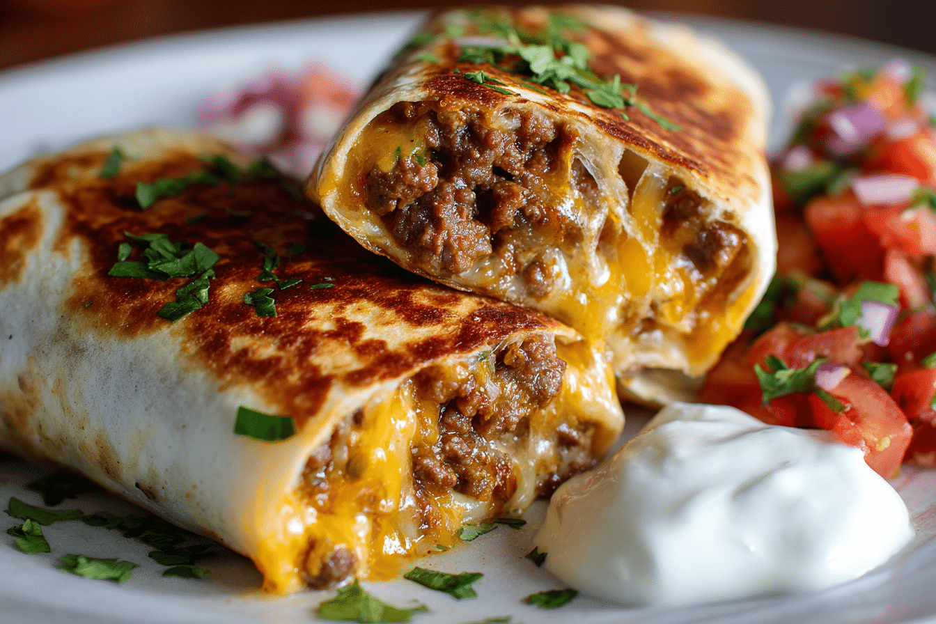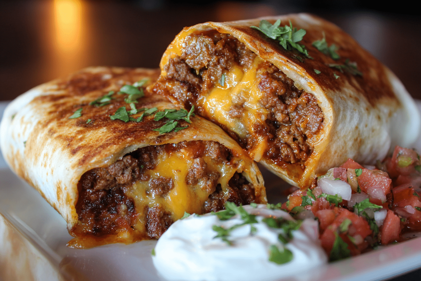 Flavorful ground beef seasoned with bold spices, wrapped in a soft flour tortilla with melty cheese, rice, beans, and fresh toppings — the ultimate homemade burrito.