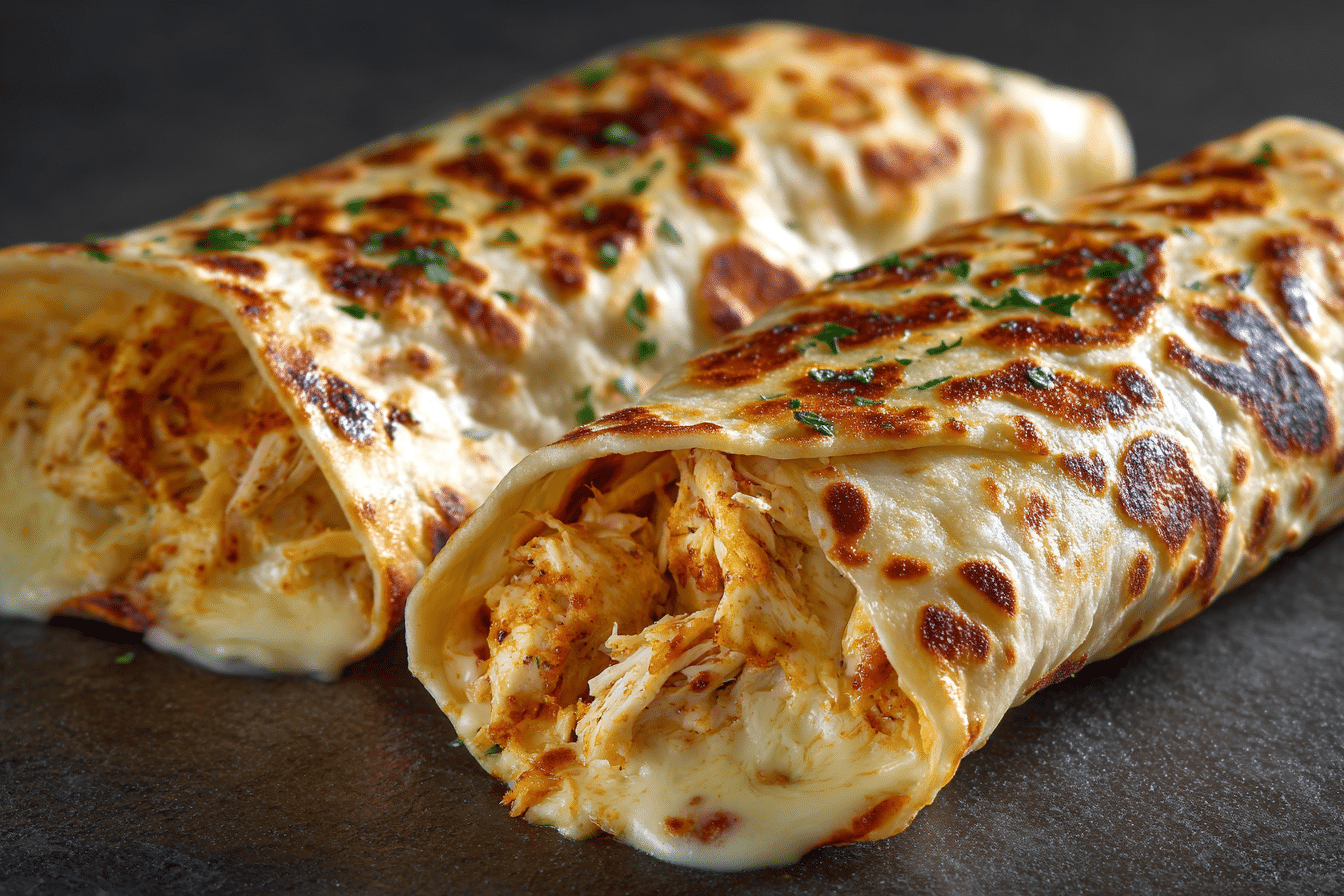 Imagine tender, seasoned chicken, sautéed in garlic butter, then tucked into a warm tortilla with gooey melted cheese and your favorite toppings. The wrap is pan-seared to golden perfection — crispy on the outside, rich and cheesy on the inside.