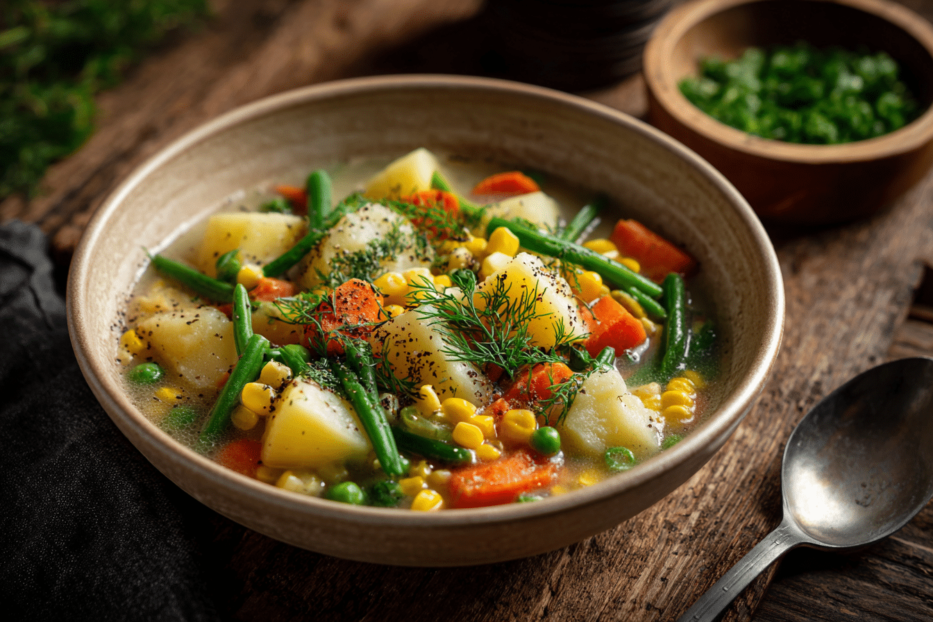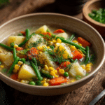 Add potatoes, green beans, peas, corn, broth, herbs, and bay leaf. Simmer 15–20 minutes.