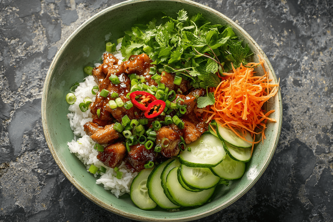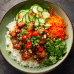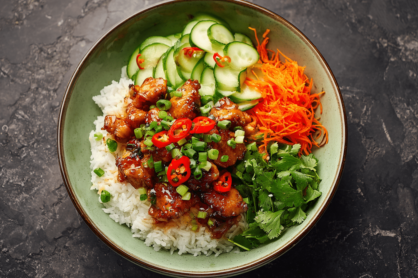 Tender chicken thighs glazed in sweet chili sauce, served over rice with fresh, crunchy veggies. A flavorful, customizable rice bowl perfect for quick dinners or meal prep.