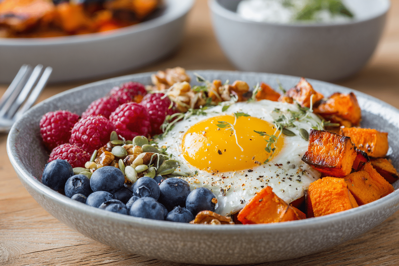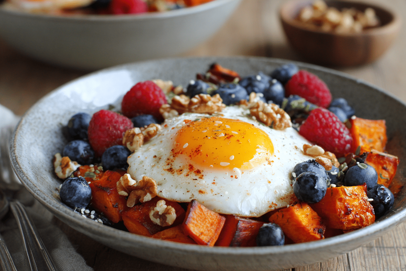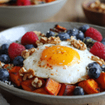 • Fried or Poached Egg (Savory Bowl): Adds protein and a rich, runny yolk that coats the sweet potato beautifully.